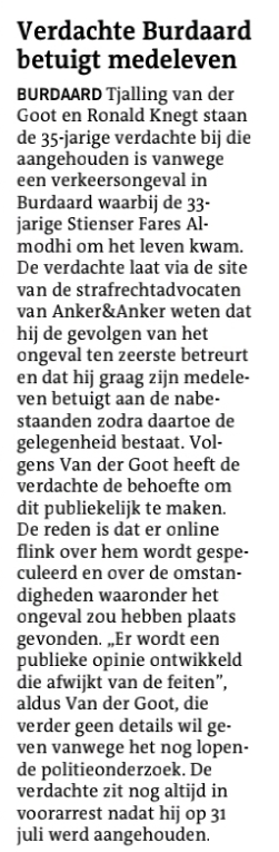 De 35-jarige verdachte die vorige week is aangehouden vanwege een verkeersongeval met dodelijke afloop in Burdaard wordt bijgestaan door Tjalling van der Goot en Ronald Knegt. De rechter-commissaris heeft het voorarrest van cliënt bevolen. Hij zit nog vast. Cliënt wenst te benadrukken dat hij de gevolgen van het ongeval ten zeerste betreurt en dat hij graag zijn medeleven wil betuigen aan de nabestaanden zodra daartoe de gelegenheid bestaat.
