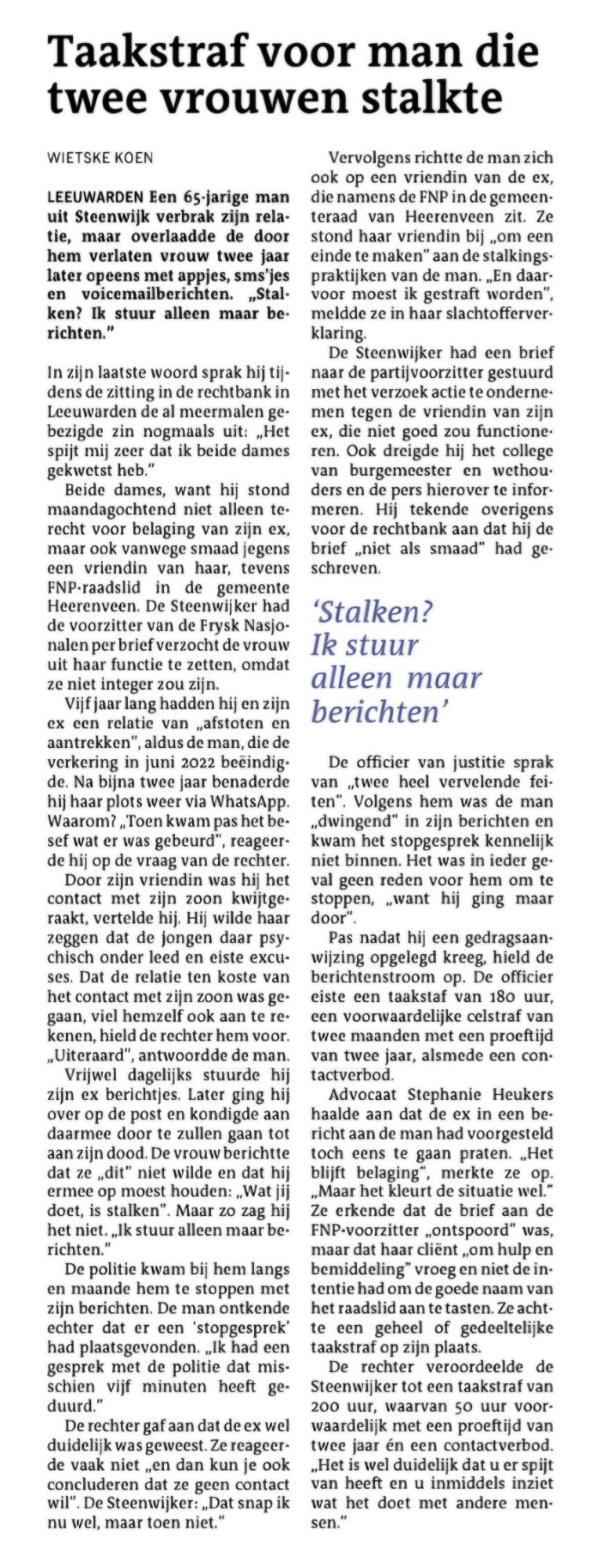 Afgelopen week werd door de politierechter in Leeuwarden een zaak behandeld tegen een 65-jarige cliënt. Hem werd verweten een ex-partner te hebben belaagd/gestalkt door het sturen van diverse apps, voicemailberichten en sms’jes. Daarnaast werd hem smaad verweten nu hij aan een politieke partij over een andere vriendin – tevens gemeenteraadslid van die partij – schreef dat ze niet integer zou zijn.