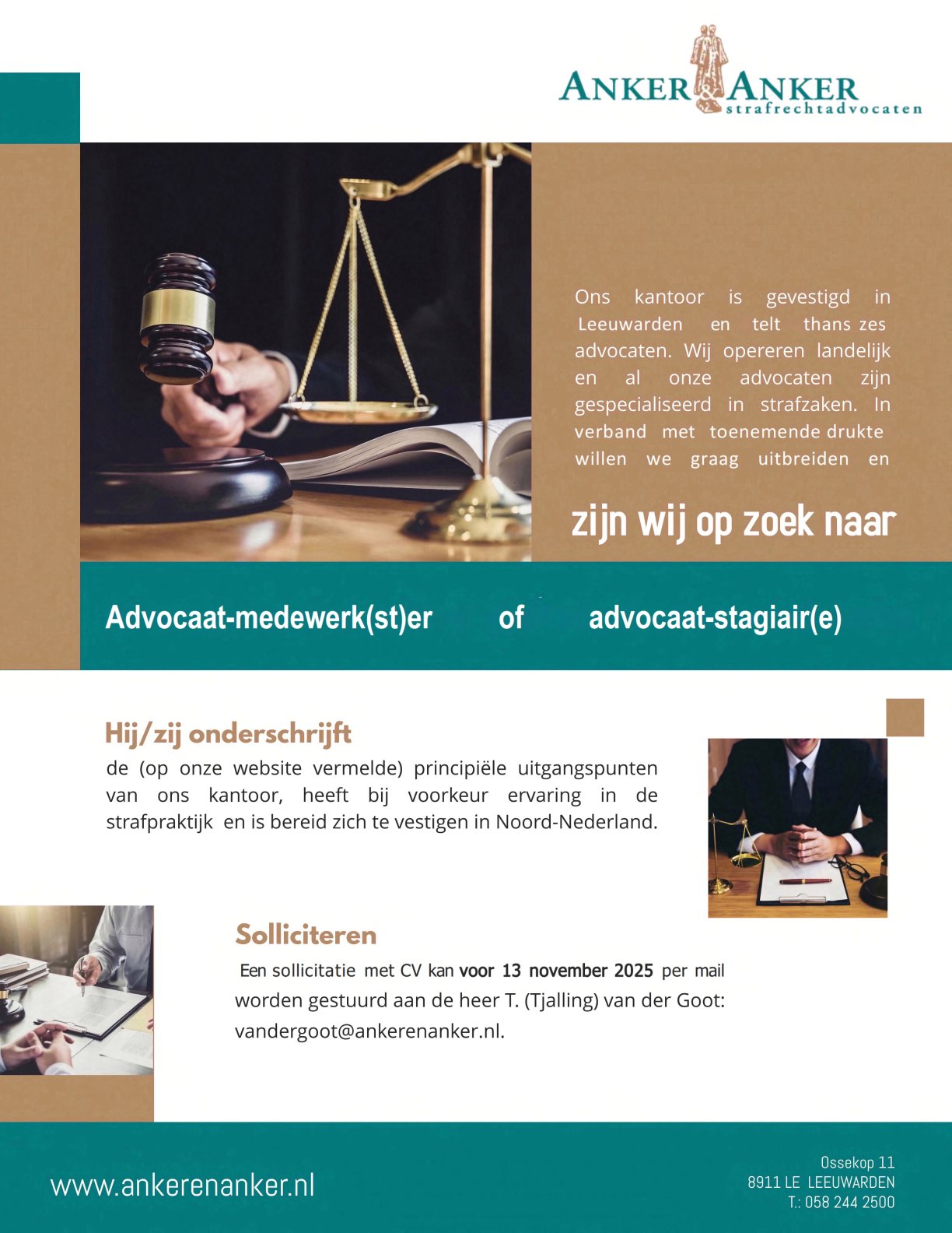 Per heden is een sollicitatieprocedure opengesteld voor de functie van advocaat-medewerker en/of advocaat-stagiair (m/v). Sollicitaties en cv kunnen voor 13 november a.s. per mail worden toegestuurd naar vandergoot@ankerenanker.nl.
