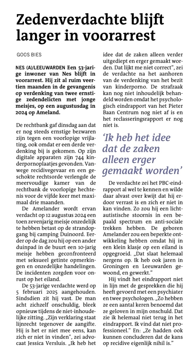 Afgelopen week vond opnieuw een pro forma zitting plaats in de Amelander zedenzaak. Een 53-jarige man wordt verdacht van twee zedenfeiten met jonge meisjes in augustus 2024. Onze cliënt verblijft al bijna anderhalf jaar in voorarrest.